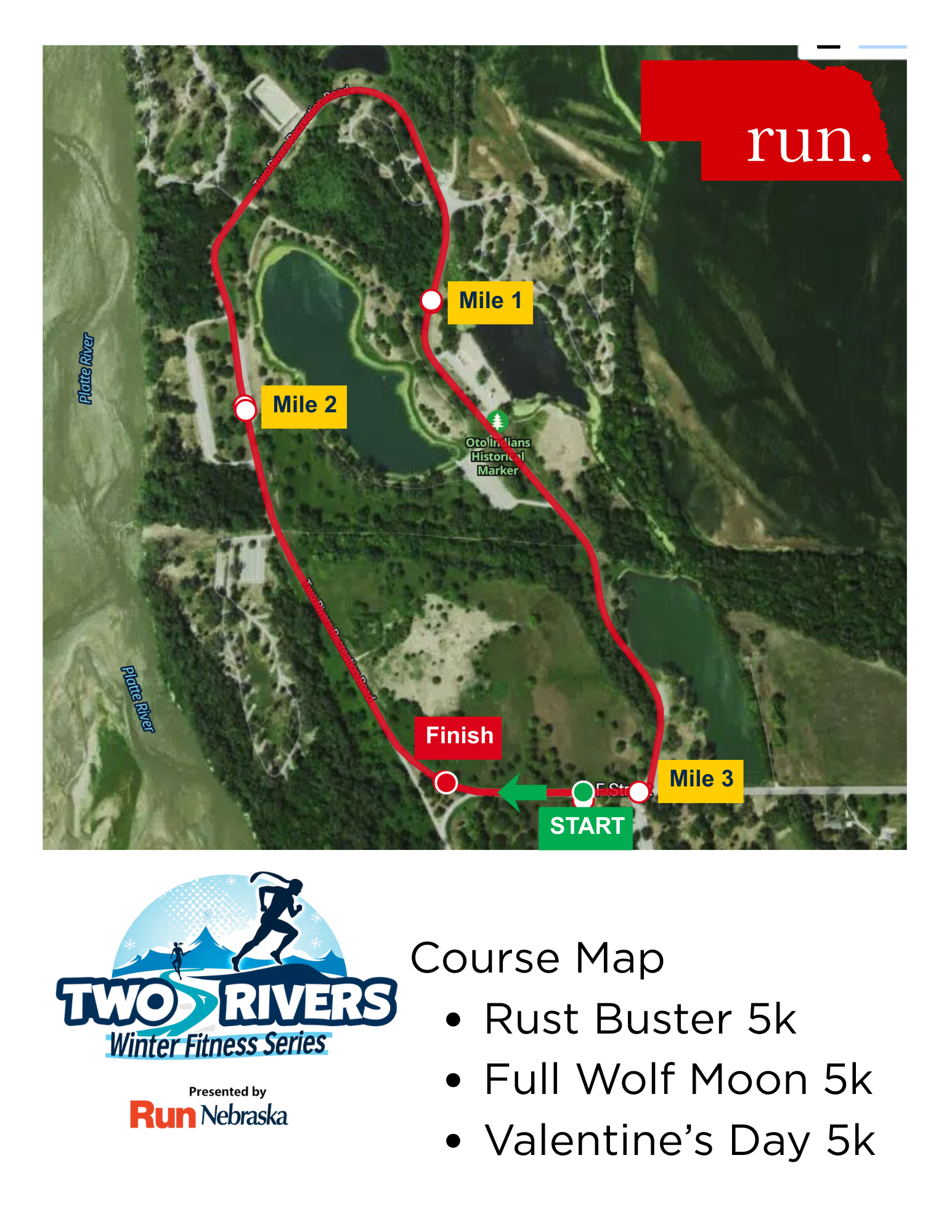 The Valetine's Day 5K is the 3rd race in 2026 Winter Fitness Series. The race takes place on a very flat 1.5 mile closed loop course at scenic Two Rivers State Park in Waterloo, NE. Just minutes west of Omaha. USATF Certified. Official times. Presented by Run Nebraska and 402 XC & Track. Great for first timers and those looking to stick to New Years Resolutions!